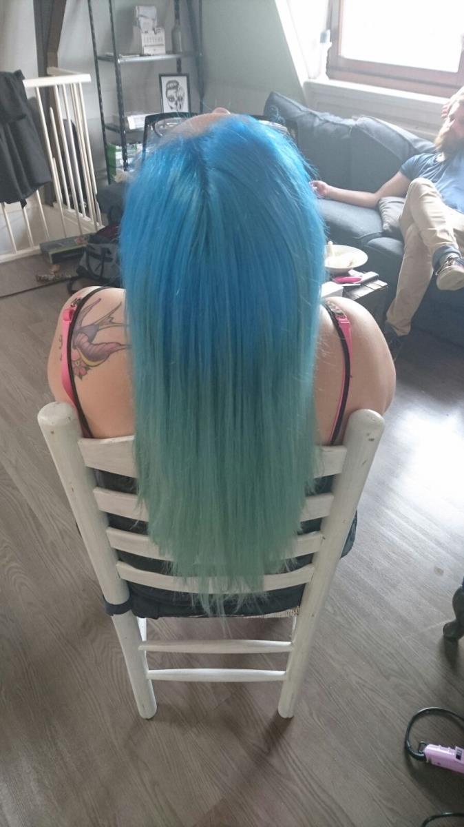 Mijnhaar was hiervoor heel licht roze. Ik had het knal roze geverfd en toen helemaal laten vervagen, bijna naar wit. De uitgroei gebleekt en toen deze kleur zo over het roze heen!
